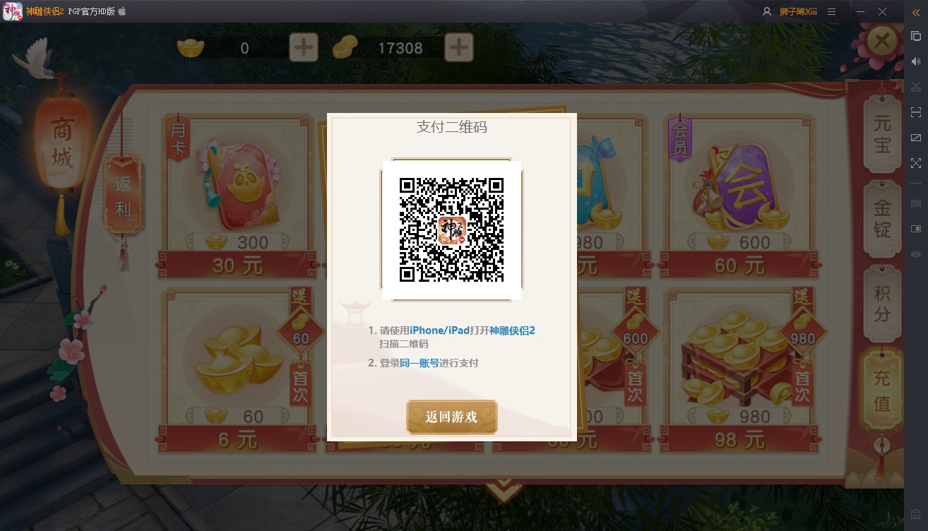 为《神雕侠侣2》手游官方HD版为游戏充值,需使用手游客户端扫码功能。 未下载《神雕侠侣2》手游客户端的用户需要先进行下载。