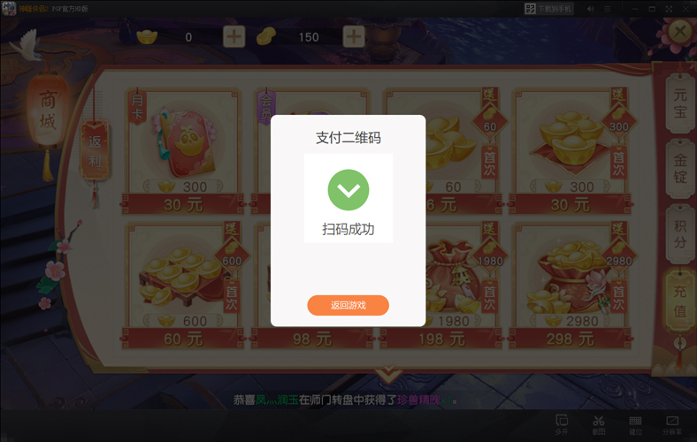 完成以上步骤您便充值成功,可以畅玩游戏啦!