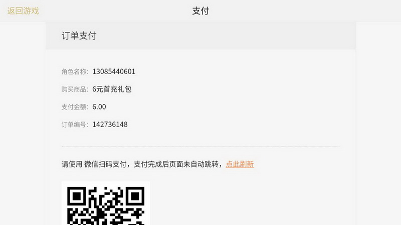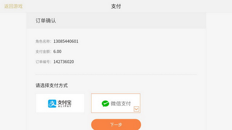 Step1:点击购买相应道具后进入如下界面,系统订单确认,确认无误后,勾选微信支付