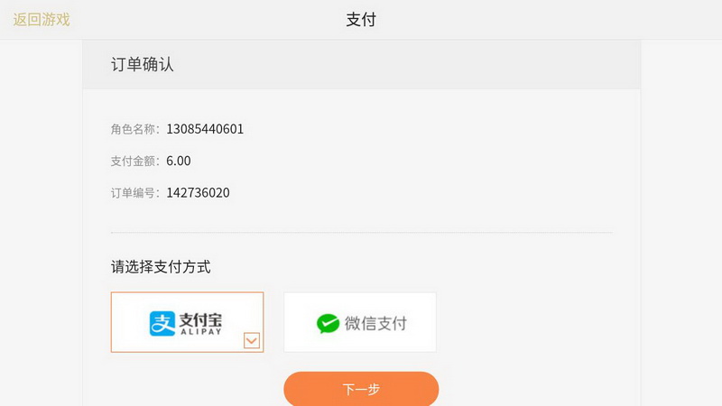 Step1:点击购买相应道具后进入如下界面,系统订单确认,确认无误后,勾选支付宝支付